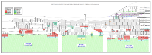 Figure 2: Longitudinal section of the Caudalosa vein system highlighting green blocks as potential resource extensions beneath historical workings