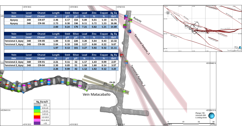Recent channel samples collected by the Company’s technical team from the Ayayay and Matacaballo vein systems, which include conjugate – or “Tensional” – veins, on Level 340 have returned high grades of silver, lead, zinc, and copper. The silver equivalent grades obtained during this round of sampling often exceed those reported in the mineral resource estimate (see https://agmr.ca/wp-content/uploads/2025/01/Final_-_7_-_AR_Tech_Report.pdf), confirming the existence of readily accessible high grade polymetallic veins at various mine levels. All samples were collected perpendicular to the veins using portable rock saws. Table 1 shows a summary of the results from the eight recently sampled channels.